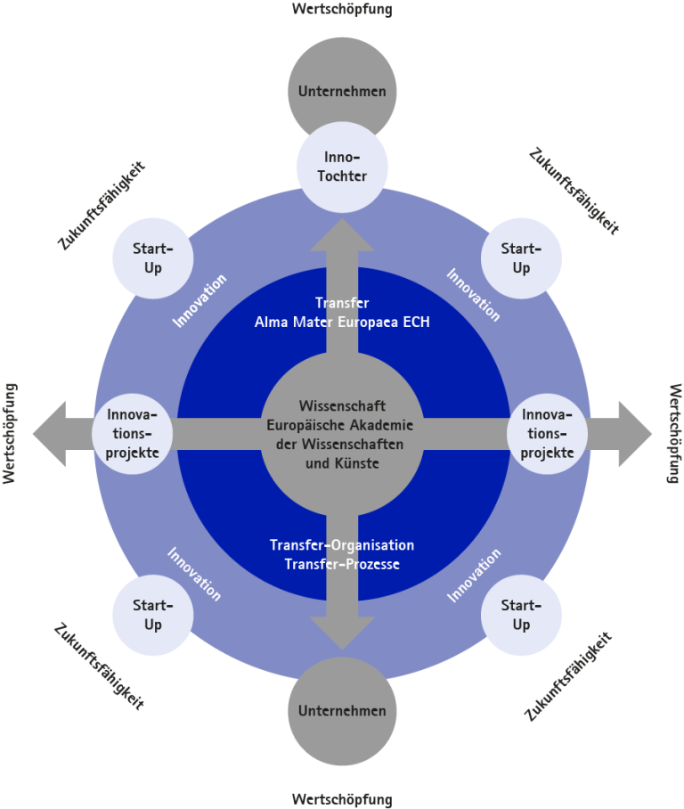 In its role as a scientific transfer institution, Alma Mater Europaea – ECH builds a structural bridge to translate knowledge into innovation. The aim is to transfer research findings into innovation and thereby into the market, the respective organization, and society.
